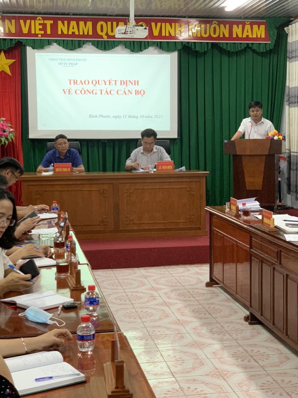 Thực hiện Quyết định số 999-QĐ/TU ngày 10/4/2018 của Tỉnh ủy về việc ban hành Đề án triển khai thực hiện Nghị quyết số 18-NQ/TW ngày 25/10/2017 của Ban Chấp hành Trung ương Đảng khóa XII một số vấn đề về tiếp tục đổi mới, sắp xếp tổ chức bộ máy của hệ thống chính trị tinh gọn, hoạt động hiệu lực, hiệu quả và Nghị quyết số 19-NQ/TW ngày 25/10/2017 của Ban Chấp hành Trung ương Đảng khóa XII về tiếp tục đổi mới hệ thống tổ chức và quản lý, nâng cao chất lượng và hiệu quả hoạt động của các đơn vị sự nghiệp công lập; Quyết định số 1131-QĐ/TU ngày 15/8/2018 của Ban Thường vụ Tỉnh ủy Bình Phước về những nội dung thực hiện Quyết định số 999-QĐ/TU ngày 10/4/2018 của Tỉnh ủy đối với Sở Tư pháp; Quyết định số 11/2019/QĐ-UBND ngày 31/01/2019 của UBND tỉnh Bình Phước về ban hành Quy định chức năng, nhiệm vụ, quyền hạn và cơ cấu tổ chức của Sở Tư pháp tỉnh Bình Phước;Quyết định số 57/2016/QĐ-UBND ngày 12/12/2016 của UBND tỉnh Bình Phước về việc ban hành Quy định phân cấp thẩm quyền quản lý công chức, viên chức trong các đơn vị sự nghiệp công lập thuộc UBND tỉnh Bình Phước. Ngày11/10/2021, tại Hội trường -Sở Tư pháptỉnh Bình Phước đã tổ chức công bố và trao Quyết định bổ nhiệmchức vụ Giám đốc Trung tâm Trợ Giúp pháp lý nhà nước cho đồng chí Vũ Thị Hải Anh; Quyết định bổ nhiệm chức vụ Phó Trưởng phòng Pháp chế cho đồng chí Phạm Thị Mai Ân. Dự và chủ trì có đồng chí Lê Tiến Hiếu–Bí thư Đảng ủy - Giám đốc Sở Tư pháp, cùng dự có đồng chí Nguyễn Trọng Trí – Phó Bí thư Đảng ủy - Phó Giám đốc Sở Tư pháp và các đồng chí là Trưởng, Phó Trưởng các Phòng, đơn vị sự nghiệp thuộc Sở. Đ/c Trần Thanh Long – Chánh Văn phòng Sở thừa ủy quyền Giám đốc Sở công bố các Quyết định bổ nhiệm Tại cuộc họp, đồng chí Trần Thanh Long – Chánh Văn phòng Sở thừa ủy quyền Giám đốc Sở công bố công bố Quyết định số 170/QĐ-STP ngày 11/102021của Giám đốc Sở Tư phápvề việc bổ nhiệm bà Vũ Thị Hải Anh giữ chức vụ Giám đốc Trung tâm Trợ Giúp pháp lý nhà nước; Quyết định số 158/QĐ-STP ngày 28/9/2021 của Giám đốc Sở Tư phápvề việc bổ nhiệm bà Phạm Thị Mai Ân giữ chức vụ phó Trưởng phòng Pháp chế. Thay mặt Đảng ủy và Ban Lãnh đạo Sở Tư pháp, đồng chí Lê Tiến Hiếu–Bí thư Đảng ủy - Giám đốc Sở Tư pháp đã trao Quyết định bổ nhiệm cho đồng chí Vũ Thị Hải Anh và đồng chí Phạm Thị Mai Ân; đồng chí Nguyễn Trọng Trí – Phó Bí thư Đảng ủy - Phó Giám đốc Sở Tư pháp cũng đã tặng hoa và chúc mừng cho 02 đồng chí. Đ/c Lê Tiến Hiếu– Giám đốc Sở Tư pháp (thứ hai từ phải sang) và đ/c Nguyễn Trọng Trí – Phó Giám đốc Sở Tư pháp(thứ hai từ trái sang) trao Quyết định bổ nhiệm và tặng hoa chúc mừng các đồng chí