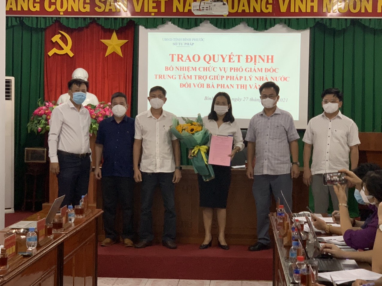 Thực hiện Quyết định số 11/2019/QĐ-UBND ngày 31/01/2019 của UBND tỉnh Bình Phước về ban hành Quy định chức năng, nhiệm vụ, quyền hạn và cơ cấu tổ chức của Sở Tư pháp tỉnh Bình Phước;Quyết định số 57/2016/QĐ-UBND ngày 12/12/2016 của UBND tỉnh Bình Phước về việc ban hành Quy định phân cấp thẩm quyền quản lý công chức, viên chức trong các đơn vị sự nghiệp công lập thuộc UBND tỉnh Bình Phước. Sáng ngày 27/8/2021, tại Hội trường Sở Tư pháp tỉnh Bình Phước đã tổ chức công bố và trao Quyết định bổ nhiệm đồng chí Phan Thị Vân – Trợ giúp viên pháp lý, Trưởng phòng Hành chính – Tổng hợpgiữ chức vụ Phó Giám đốc Trung tâm Trợ giúp pháp lý nhà nước. Dự và chủ trì có đồng chí Lê Tiến Hiếu–Bí thư Đảng ủy - Giám đốc Sở Tư pháp, cùng dự có đồng chí Nguyễn Trọng Trí – Phó Giám đốc Sở Tư pháp và các đồng chí là Trưởng, Phó Trưởng các Phòng, đơn vị sự nghiệp thuộc Sở. Đ/c Trần Thanh Long – Chánh Văn phòng Sở thừa ủy quyền Giám đốc Sở công bố Quyết định bổ nhiệm Tại cuộc họp, đồng chí Trần Thanh Long – Chánh Văn phòng Sở thừa ủy quyền Giám đốc Sở công bố Quyết định số 130/QĐ-STP ngày 29/7/2021của Giám đốc Sở Tư phápvề việc bổ nhiệm viên chức lãnh đạo cho đồng chí Phan Thị Vân giữ chức vụ chức vụ Phó Giám đốcTrung tâm Trợ giúp pháp lý nhà nước. Thay mặt Đảng ủy và Ban Lãnh đạo Sở Tư pháp, đồng chíLê Tiến Hiếu–Bí thư Đảng ủy - Giám đốc Sở Tư phápđã trao Quyết định bổ nhiệm cho đồng chí Phan Thị Vân; đồng thời, đồng chí Nguyễn Trọng Trí – Phó Bí thư Đảng ủy - Phó Giám đốc Sở Tư pháp đã tặng hoa và chúc mừng cho đồng chí.